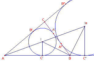 en straal ra. Omdat de raaklijnstukken uit A, B, C aan de incirkel gelijk zijn, hebben we: AB' + BC' + CB' = s. Dus BC' = s - b en (evenzo) ook AC' = s - a. Op analoge wijze vinden we bij de uitcirkel: AC" = s en BC" = s - c Uit de gelijkvormigheid van de driehoeken AC'I en AC"Ia leiden we af: IC' : IaC" = AC' : AC" |