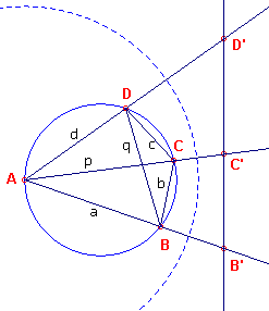We kiezen een inversie met centrum A. Hierdoor gaat de omgeschreven cirkel van ABCD over in een rechte lijn (zie eigenschap 3.4). Op deze rechte lijn liggen de punten B', C, en D'. Volgens eigenschap 5.1 is nu B'C' = k2/ap . b C'D' = k2/dp . c B'D' = k2/ad . q Omdat B'C' + C'D' = B'D' hebben we nu k2b/ap + k2c/dp = k2q/ad Deling door k2 en vermenigvuldiging met adp geeft uit deze relatie: bd + ac = pq � |